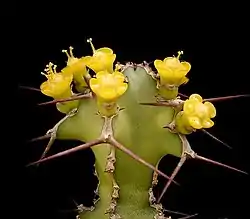 Euphorbia: nombre genérico que deriva del médico griego del rey Juba II de Mauritania (52 a 50 a. C. - 23), Euphorbus, en su honor – o en alusión a su gran vientre – ya que usaba médicamente Euphorbia resinifera. En 1753 Carlos Linneo asignó el nombre a todo el género.[5]