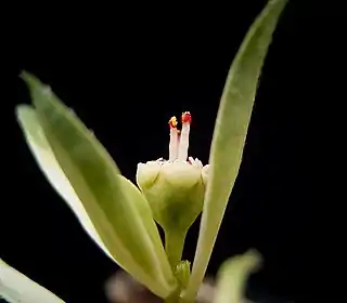 Las flores de estas plantas se encuentran muy modificadas, la estructura que parece una flor, es decir la que lleva el ovario y los estambres, es en realidad una inflorescencia llamada ciatio, que en su interior lleva numerosas flores masculinas (representadas exclusivamente por estambres desnudos) y una flor femenina (representada por un ovario con 3 estilos cuyas puntas se parten en 2 ramas, el ovario sobre una larga columna); estos ciatios de hasta 4 mm de largo son globosos, con dientes en el borde superior, por entre los que asoman los estambres y el ovario, ligeramente debajo de los dientes se encuentran de 1 a 6 grandes glándulas en forma de copa. El fruto es una cápsula trilobada, sin pelos, que cuelga del ciatio, al madurar se separa en 3 partes y cada una se abre para dejar salir su única semilla, éstas cenicientas, ovoides, picudas en el ápice, con la superficie cubierta de protuberancias y depresiones dispuestas en forma irregular. La raíz es tuberosa, a veces muy engrosada, generalmente bastante más larga que la parte aérea de la planta.[2]