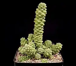 Se trata de una planta perenne con tallosuculento y con las inflorescencias en ciatios. Tiene un rizoma carnoso grueso, tallos erectos, decumbentes o rizomatosos, de hasta 40 cm de largo, 1,5-3 cm de grosor, mosaico, con prominentes tubérculos cónicos que llevan las hojas por lo general en 5 series en espiral.[2]