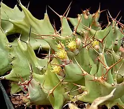 Es una planta suculenta, cespitosa perennifolia espinosa enana, arbusto con una amplia raíz tuberosa alargada fusionada en un tallo subterráneo corto para formar un cuerpo de 30x15 cm.