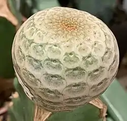 Planta perenne suculenta, con un cuerpo globoso de 4 cm de diámetro, parcialmente enterrado, por lo general un poco deprimido, planta muy madura ocasionalmente con división dicotómica,[2] cuerpo con marcas de mosaico de ± 5 mm de diámetro en 14-20 hileras longitudinales;[3]