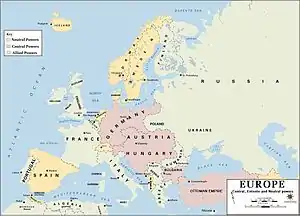 El escenario europeo está dividido en cuatro principales lugares de operaciones: el Frente Occidental, el Frente Oriental, el Frente italiano, y el Frente de los Balcanes. Sin embargo, no todos los países europeos se vieron involucrados o envueltos en la guerra. El Reino Unido no fue casi tocado por la guerra. La mayor parte de Francia no se vio afectada, al igual que la mayor parte de Alemania y de Italia. Algunos grandes países de Europa se mantuvieron neutrales durante la guerra, como Suecia y España - la gran guerra pasado por alto, sin mucho impacto. Por otra parte, algunos países fueron conquistados (Serbia, Bélgica, Rumania). Otros países como Rusia y el Imperio Otomano vieron marchar a los ejércitos en la mayor parte de sus tierras, con una gran devastación como resultado.