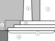 Partes inferiores de un templo antiguo. 1: columna. 2: muro 3: estilóbato o toicobato. 4: estereobato. 5: eutinteria. 6: crepidoma.