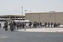 El pánico se extendió entre la población civil cuando los talibanes comenzaron a apoderarse de la capital, y muchos ciudadanos corrieron a sus hogares o al aeropuerto, que permaneció bajo el control de la OTAN después de la disolución del gobierno afgano.[11][18][19] Se desarrolló una situación caótica cuando miles de civiles afganos que huían se apresuraron al aeropuerto de Kabul, y cientos se apiñaron en la pista en un intento de tomar vuelos fuera de la ciudad; algunos habían trepado por los muros limítrofes para entrar en la pista de aterrizaje.[20][21] Los soldados estadounidenses sobrevolaron helicópteros a poca altura como control de multitudes, lanzaron granadas de humo y ocasionalmente dispararon tiros de advertencia al aire para dispersar a las personas que intentaban abordar a la fuerza el avión.[22][23][24] Surgieron imágenes de video que mostraban a cientos de personas corriendo junto a un avión de transporte C-17A en movimiento de la Fuerza Aérea de Estados Unidos Rodando en la pista; se podía ver a algunas personas aferradas al avión, justo debajo del ala. Otros corrían al lado "saludando y gritando".[25] Según los informes, al menos dos personas, en un aparente intento de polizón, "se cayeron del tren de aterrizaje inmediatamente después del despegue". Posteriormente se encontró otro cuerpo en el tren de aterrizaje del C-17.[26] Una de las víctimas se identifica como Zaki Anwari, que había jugado para la selección nacional de fútbol juvenil de Afganistán.[27] También se encontraron tres cuerpos, incluido el de una mujer, en el suelo cerca del edificio de la terminal de pasajeros, pero su causa de muerte no estaba clara, aunque algunos observadores especularon que podrían haber muerto durante una estampida humana.[22][28] Finalmente, se confirmó que siete personas murieron durante la evacuación del aeropuerto, incluidos dos hombres armados que recibieron disparos tras disparar contra soldados estadounidenses, según el Departamento de Defensa. Los soldados no resultaron heridos y los hombres no fueron identificados.[22][29]