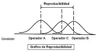 Por tanto, se define la reproducibilidad como el promedio de variaciones debidas a la toma de medidas con el mismo sistema de medición empleado por distintos operarios.
