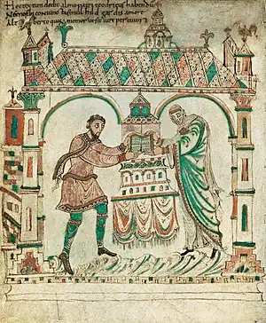 Hacia 975 pasó a manos de Teodorico II, conde de Holanda, quien lo donó a la Abadía de Egmond, probablemente para conmemorar la dedicación de su iglesia, que había mandado reconstruir en piedra. Para dar testimonio del hecho, encargó que se agregaran dos miniaturas. Una muestra a Teodorico y su esposa Hildegard mientras depositan el manuscrito en el altar; en la otra se ve al matrimonio en oración frente a Adalberto de Egmond, santo patrón de Egmond.[2]