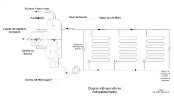 Un evaporador sobrealimentado es aquel en el cual la cantidad de refrigerante líquido en circulación a través del evaporador ocurre con considerable exceso y que además puede ser vaporizado. El exceso del líquido es separado del vapor en un receptor de baja presión o acumulador y es recirculado hacia el evaporador, mientras que el vapor es extraído por la succión del compresor. Los rangos de razón de circulación son desde un valor de 2 a 1 hasta valores altos de 6 o 7 a 1, se usan los rangos altos con amoníaco y los bajos con los refrigerantes 12, 22, y 502. Un rango de circulación de 3 a 1 indica que se tiene en circulación tres tantos de líquido circulando que pueden ser vaporizados, en cuyo caso la composición de refrigerante en el cubo de regreso al acumulador estará compuesta por peso,de dos partes de líquido y una parte de vapor.