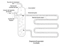Los evaporadores inundados trabajan con refrigerante líquido con lo cual se llenan por completo a fin de tener humedecida toda la superficie interior del intercambiador y, en consecuencia, la mayor razón posible de transferencia de calor. El evaporador inundado está equipado con un acumulador o colector de vapor el que sirve, a la vez, como receptor de líquido, desde el cual el refrigerante líquido es circulado por gravedad a través de los circuitos del evaporador. Preferentemente son utilizados en aplicaciones industriales, con un número considerable de evaporadores, operando a baja temperatura y utilizando amoníaco (R717) como refrigerante.