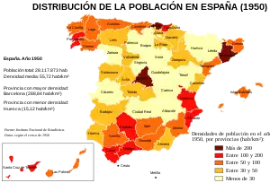 Así, el periodo 1950-1981 fue una época de grandes descompensaciones regionales, sin precedentes en la historia demográfica española. En este periodo, la provincia de Madrid ganó 2.800.675 de habitantes, y la de Barcelona 2.386.615 (sus poblaciones más que doblándose en 30 años).[5] Sin embargo, mientras tanto 23 provincias perdieron de manera absoluta población, y Extremadura, Castilla-La Mancha, Castilla la Vieja y el antiguo Reino de León (salvo el foco de Valladolid), gran parte de Andalucía y Aragón (salvo el foco de Zaragoza) vieron reducidos de manera muy importante su capital humano.