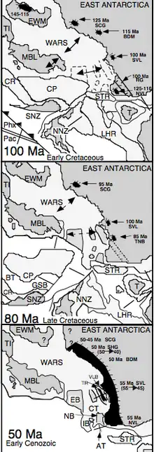- Convergencia de material cortical, que ocurre cuando la zona de rift empuja la placa de la Antártida Occidental hacia la placa de la Antártica Oriental, que es mucho más fuerte.[2]