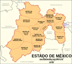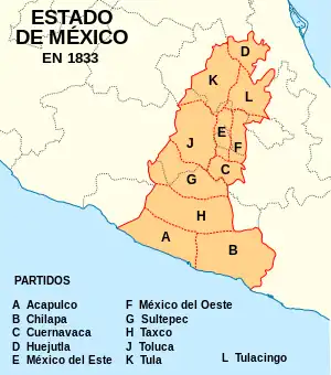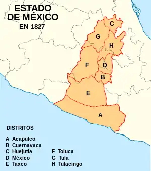 Por la Constitución Centralista de 1837 desaparece el Estado de México y su territorio junto al del territorio de Tlaxcala forman el Departamento de México, en el decreto de su formación del 23 de diciembre de 1837, este se conforma por los distritos de México o Centro, Acapulco, Chilapa, Cuernavaca, Mextitlan, Taxco, Toluca, Tulancingo, Temazcaltepec y Texcoco.[7][8]|- | ||||||