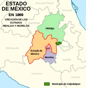 En 1869 se separan del territorio estatal los Distritos de Tula, Tulancingo, Ixmiquilpan, Zimapan, Huichapan, Actopan, Huascazaloyan, Pachuca, Huejutla, Zacualtipan y Apan, para formar el estado de Hidalgo, bajo el decreto federal del 15 de enero de 1869.[6]