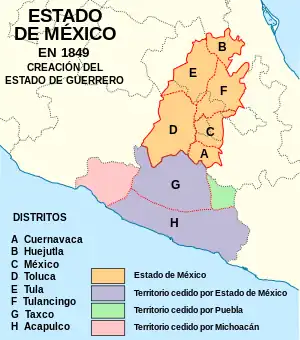 Por ese decreto se cedían al nuevo estado los Distritos de Acapulco, Chilapa y Taxco. La creación del nuevo estado se ratificó con el decreto No. 16 del 30 de mayo de 1849.[6] | ||||||