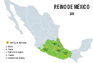 Durante este periodo su capital fue la Ciudad de México, donde residía el Virrey, la Real Audiencia de México, el Cardenal Primado de México y hasta el Marqués del Valle de Oaxaca en su momento.[1] Durante este periodo el territorio se subdividía en Corregimientos, y Alcaldías, a los cuales no se les asignó un territorio en si, por eso es muy común encontrar que los límites se traslapaban, incluso se nombran los reinos o provincias de México, Tlaxcala y Michoacán en muchos documentos de la época.[1] | ||||||