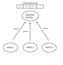 Este algoritmo pertenece a los no basados en tokens y es quizá el más fácil de implementar para crear la exclusión mutua distribuida. En esta solución, cuando uno de los procesos quiera acceder a la sección crítica, deberá enviar un mensaje de tipo REQUEST a un servidor central que será el encargado de recibir todas las peticiones de acceso y de ir concediendo los permisos a las distintas peticiones. Cuando el proceso reciba el mensaje de permiso, podrá acceder a la sección crítica y cuando acabe, deberá enviar un nuevo mensaje al servidor central para avisar de que ha finalizado y ya se encuentra disponible la sección crítica para otro proceso (mensaje de tipo RELEASE).
