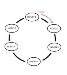 En este algoritmo la entrada a la sección crítica se basa en la posesión o no de un testigo (token), que se van pasando todos los nodos en forma circular. Cuando un nodo consigue el testigo, puede entrar a la sección crítica debiendo liberarlo y pasarlo cuando sale de ella hacia el siguiente nodo.
