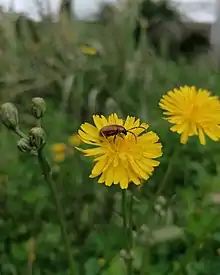 Los adultos, aunque pueden alimentarse de las flores de diversas plantas silvestres, tienen una marcada preferencia por las flores de Asteraceae, sobre las que se encuentran frecuentemente grupos de adultos.
