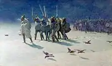 Los varegos o varangios (en idioma ruso y ucraniano: Варяги, Varyagui/Varyahy) a veces llamados varengos, eran escandinavos que emigraron hacia el este y el sur a través de lo que hoy es Rusia, Bielorrusia y Ucrania principalmente en los siglos IX y X. Comprometidos con el comercio, la colonización, la piratería y las actividades mercenarias, vagaron por los sistemas fluviales y los puertos de Garðaríki, llegando y asentándose en el mar Caspio y Constantinopla.[110]