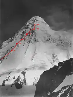La expedición se juntó a finales de mayo en la ciudad de Rawalpindi, volaron a la ciudad de Skardu, y después de una larga caminata a través del pueblo de Askole y el glaciar Baltoro, llegaron a la base del K2 el 20 de junio. Las primeras etapas del ascenso se desarrollaron sin problemas, aunque el progreso fue lento debido a las tácticas de la expedición. Las tragedias en el Nanga Parbat en 1934 y del K2 en 1939 habían convencido a Houston de la importancia de mantener todos los campamentos bien surtidos en caso de que la expedición tuviera que retroceder por mal clima. Hacer esto requirió que los escaladores hicieran viajes extra arriba y abajo de la montaña cargando suministros adicionales, pero esto fue crucial para su supervivencia.[21]