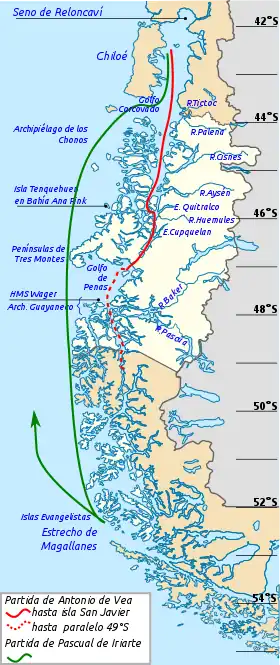 El 28 de noviembre salió la expedición desde el astillero de Chiloé[2]: 557 [2]: 555 [notas 2] Cerca de nueve dalcas adicionales salieron con los dos botes grandes traídos desde El Callao por la expedición.[2]: 557 [7] La partida de Vea tenía como guía a Bartolomé Gallardo, un soldado criollo que había explorado la región el verano anterior con el jesuita Antonio de Amparán y Cristóbal Talcapillán.[7][3] La partida de Vea estaba compuesta de 70 españoles, entre ellos 16 marinos de Perú y Chile más 60 canoeros.[7] Durante el viaje al sur, la expedición encontró bosques del ciprés de las Guaitecas que de Vea llamó cipreses españoles[2]: 564 y pescó con redes más de 200 Dissostichus eleginoides conocida hoy como merluza chilena.[2]: 564