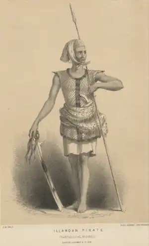![]() Un pirata del mar de Joló armado con una espada kampeli, una lanza y un kris, en una ilustración británica contemporánea. | ||||