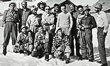 - Los miembros del equipo fueron, desde la izquierda de pie: Ubaldo Rey, Ugo Angelino, Walter Bonatti, Ardito Desio (jefe, brazos cruzados), Lino Lacedelli, Erich Abram, Gino Soldà, Achille Compagnoni, Cirillo Floreanini. Desde la izquierda sentados: Sergio Viotto, Mario Fantin (cámara), Guido Pagani (doctor), Pino Gallotti.