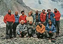 - En la foto de grupo de junio, los miembros del equipo fueron: de pie, de izquierda a derecha: Achille Compagnoni, Ugo Angelino, Gino Pagani (doctor), Mario Fantin (filmador), Ardito Desio (líder, con los brazos cruzados), Erich Abram, Gino Solda, Lino Lacedelli, Walter Bonatti, Sergio Viotto, Pino Gallotti; delante: Ubaldo Rey, Cirillo Floreanini, Mario Puchoz.