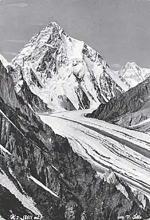 Hubo tres intentos estadounidenses fallidos en la montaña, aunque sirvieron para identificar una buena ruta hacia la cima. Desio pensó que las anteriores campañas de exploración italianas de la región del Karakórum eran una buena razón para organizar una importante expedición a gran escala, siguiendo la ruta estadounidense por la cresta sureste. El progreso hacia la cumbre fue interrumpido repetidamente por las tormentas y un miembro del equipo murió inesperadamente. Desio consideró abandonar la expedición para volver a intentarlo ese mismo año, pero las condiciones climáticas mejoraron, lo que les permitió acercarse más a la cima de la montaña. Finalmente, los dos líderes escaladores llegaron a la cima cuando el sol estaba a punto de ponerse y tuvieron que descender en la oscuridad. Ambos escaladores y otros dos compañeros sufrieron congelaciones severas.