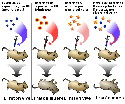 El experimento de Griffith, comunicado en 1928,[4] identificó que algún "principio transformador" de las bacterias neumocócicas podía transformarlas de un tipo a otro. Griffith, médico británico, había pasado años aplicando la tipificación serológica a los casos de neumonía, una enfermedad frecuentemente mortal a principios del siglo XX. Descubrió que a lo largo de un caso clínico de neumonía solían estar presentes múltiples tipos -algunos virulentos y otros no- y pensó que un tipo podría transformarse en otro (en lugar de que simplemente estuvieran presentes múltiples tipos todo el tiempo). Al comprobar esa posibilidad, descubrió que la transformación podía producirse cuando se inyectaban en ratones bacterias muertas de un tipo virulento y bacterias vivas de un tipo no virulento: los ratones desarrollaban una infección mortal (normalmente sólo causada por bacterias vivas del tipo virulento) y morían, y las bacterias virulentas podían aislarse de esos ratones infectados.[5]