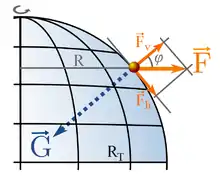 El sistema de referencia de la Tierra no es un sistema inercial de referencia, ya que la Tierra gira sobre su eje Norte-Sur. Las fuerzas principales que actúan sobre las masas, y , son las fuerzas de la gravedad, y , y las fuerzas centrífugas, y , que se han de introducir debido a la rotación de la Tierra si se supone esta sin movimiento. La gravedad se calcula aplicando la ley de la gravitación universal de Newton, que depende de la masa gravitatoria, y , de la masa gravitatoria de la Tierra, , del radio de la Tierra, , y de la constante de gravitación universal, :