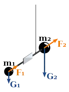 que dará lugar a una pequeña desviación del brazo en el plano horizontal, el cual se puede medir gracias a la fuerza recuperadora de torsión del alambre. En un péndulo de torsión, como el de una balanza de torsión, el momento de fuerza, , es proporcional al ángulo de giro de la balanza, siendo la constante de proporcionalidad el módulo de torsión, , que es conocido. Por tanto resulta que .[5]