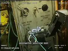 En la mañana del 22 de abril, el suboficial de la Guardia Costera Ashley Butler declaró que "el petróleo se estaba escapando de la plataforma a un ritmo de unos 340 000 galones estadounidenses; 1.300.000 litros) de crudo por día".[57] Esa tarde la Guardia Costera El suboficial sénior Michael O'Berry utilizó la misma figura. Se enviaron dos vehículos submarinos operados por control remoto (ROV) en un intento de tapar el pozo, pero no tuvieron éxito.[42] Butler advirtió sobre una fuga de hasta 700000 galones estadounidenses de combustible diésel, y el vicepresidente de BP, David Rainey, calificó el incidente como un posible "derrame importante".[42] El 23 de abril, según los informes, un ROV no encontró ninguna fuga de aceite. de la plataforma hundida y no fluye petróleo del pozo.[58] La contralmirante de la Guardia Costera Mary Landry expresó un optimismo cauteloso de impacto ambiental cero, afirmando que no emanaba petróleo ni de la boca del pozo ni de las tuberías rotas y que el petróleo derramado por la explosión y el hundimiento estaba siendo contenido.[59][60][61][62] El 24 de abril, Landry anunció que una boca de pozo dañada estaba derramando petróleo en el Golfo y lo describió como "un derrame muy grave".[63]