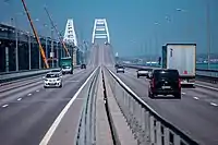 En la madrugada del 8 de octubre de 2022, en el contexto de la invasión rusa de Ucrania, se produjo una explosión repentina en la calzada del puente de Crimea, causando el colapso de dos tramos del tablero del puente carretero. La explosión también provocó la ignición de siete vagones cisterna de un tren que circulaba por el puente ferroviario, iniciando un gran incendio.[1]