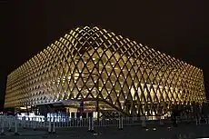 - El edificio, que fue construido por el arquitecto chino He Jingtang, es una de las cinco construcciones que permanecieron después de la conclusión de la exposición. Ocupa un área de 140,000 m² y tiene una altura de 63 m. Está inspirado en la forma de las antiguas coronas imperiales chinas. La fachada está constituida por cuatro amplias columnas y el cuerpo central: una pirámide truncada, que se compone de cinco niveles exteriores, de mayor superficie conforme se sube, cubiertos por medio de vigas de acero pintada de color rojo y grandes ventanas corridas de cristal oscuro. Las vigas están entrelazadas por medio de la técnica dougong. El techo está configurado como el esquema típico de un sudoku.