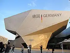 Alemania – estuvo en la sección C9 y su lema fue «Balancity». Fue un edificio de geometría caprichosa y líneas pronunciadas que asemejan a una serpiente compuesta por cuatro cuerpos, cuya fachada estuvo recubierta con una membrana textil plateada, y que reposaba en una especie de cantera que mostraba diferentes capas de tierra. Esta combinación de elementos brindó al pabellón una serie de espacios abiertos en su interior, algunos usados como áreas verdes. Por medio de pasajes, cintas transportadoras y túneles, se exploraban las diferentes áreas temáticas que mostraron diversos aspectos de un viaje por una ciudad: "A través del paisaje", "Límites de la ciudad", "El puerto", "La oficina de proyectos", "El depósito", "La fábrica", "El parque", "El taller artístico", "La plaza urbana" y "El foro", para terminar en la sala "La central energética", un espacio cilíndrico que ofrecía una representación multimedia por medio de una enorme esfera que giraba colgada por un cable de alambre y que mostraba un vídeo espectacular. El día nacional de este país en la Expo fue el 19 de mayo.[14]