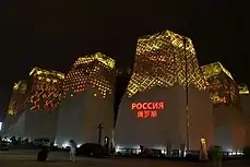 Rusia – en la sección C7 y su lema era «Nueva Rusia: Ciudades y personas». El pabellón estuvo concebido como una ciudad de cuento de hadas con un gran árbol (el "Árbol de la vida") en el centro y un bosque de flores y frutas enormes. Su diseño, basado en el libro Las aventuras de Nosabenada y sus amigos del escritor soviético Nikolái Nósov, consistía en 12 torres diferentes de 20 m de altura, pintadas de color blanco y dorado y con motivos ornamentales tradicionales rusos en color rojo y plateado, que rodean el edificio central, llamado «Cubo de la civilización». Contó con las cuatro áreas temáticas siguientes: "Regiones de la Federación Rusa", "Nuevas tecnologías para actividades vitales", "La ciudad del futuro a través de los ojos de los niños" y "Ciudad de talentos". El día nacional de este país en la Expo fue el 28 de septiembre.[23]