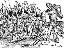 - Schedel no menciona los acontecimientos de 1421. La xilografía se emplea en tres ocasiones e ilustra acontecimientos de los años 1298, 1337 y 1492, en los que «el desangelado, quejoso y desconsolado pueblo de los judíos [...] fue quemado» [öde jamerig und trostlose volck der iuden … verprennt worden]; en dos casos la acusación se refiere a la profanación de la hostia.