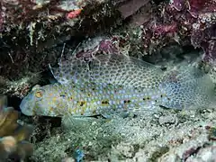 Es un pez de Mar y, de clima tropical y asociado a los arrecifes de coral que vive entre 10-50 m de profundidad.