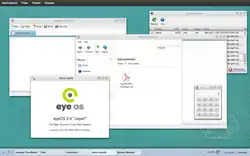 EyeOS fue una plataforma de nube privada con una interfaz de escritorio basada en la web. Comúnmente llamado escritorio en la nube por su interfaz única, eyeOS proporcionaba un escritorio completo desde la nube con gestión de archivos, herramientas de gestión de la información personal, herramientas colaborativas y aplicaciones de la compañía.