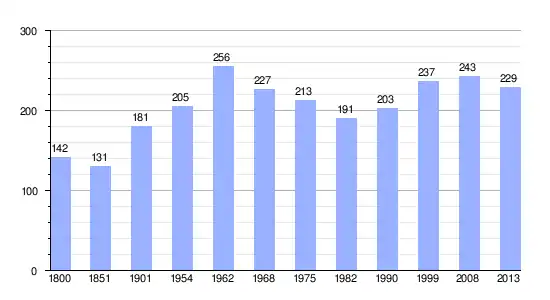 Los datos demográficos contemplados en este gráfico de la comuna de Eyguians[4] se han cogido de 1800 a 1999 de la página francesa EHESS/Cassini, y los demás datos de la página del INSEE.[5]