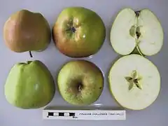 ![]() La variedad de manzana 'Eynsham Challenger' con secciones cruzadas. | ||