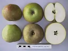 ![]() La variedad de manzana 'Eynsham Dumpling' con secciones cruzadas. | ||