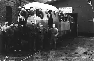 ![]() Trabajadores sobre el Coche Motor Presidente Perón, otra de las máquinas salidas de la F.A.deL. en los Talleres Liniers. | ||