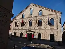 El edificio presenta una planta rectangular con dos alturas y un hastial. En la planta baja se sitúa la portada, que está formada por un arco rebajado con cornisa triangular, decorada con mensulillas. En ambos lados de la misma se abren dos ventanas con arco de medio punto y decoración en el extradós, a modo de resaltes de las dovelas. Las cuatro ventanas presentan rejería de forja, delicadamente trabajada.