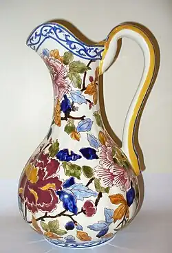 - los llamados «Gien» en fondo marrón, negro o azul, con decoración de la mayólica del Renacimiento italiano, de grotescos y amorcillos. Llevando a cabo una imitación en particular de los productos de Faenza, Urbino o Savona;