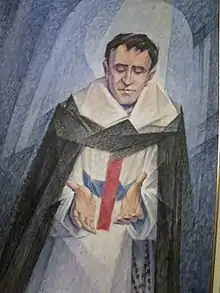 | Atributos | Vestido con el hábito trinitario, sentado con las manos debajo del escapulario o abiertas en actitud de entrega. | ||