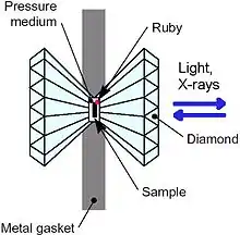 La celda de yunque de diamante es un pequeño dispositivo de sobremesa para concentrar la presión. Puede comprimir una pequeña pieza de material (tamaño submilimétrico) a presiones extremas, que pueden superar los 3.000.000 de atmósferas (300 gigapascales).[7] Esto está más allá de las presiones en el centro de la Tierra. La concentración de presión en la punta de los diamantes es posible debido a su dureza, mientras que su transparencia y alta conductividad térmica permiten una variedad de sondas para examinar el estado de la muestra. La muestra se puede calentar a miles de grados.