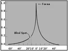 El diagrama muestra la agudeza relativa del ojo humano izquierdo (sección horizontal) en grados desde la fóvea.
