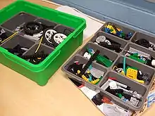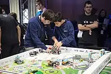Equipos de FIRST LEGO League pueden utilizar "cualquiera de las partes hechas por LEGO en su condición de fábrica original" para construir sus robots.[7] Los robots están programados utilizando cualquier lengua que permita el movimiento autónomo. Muchos equipos optan para una platafroma de codificación de bloques como el EV3 software oficial, el NXT-software oficial (ahora expirado), o Robolab. Todos estos están construidos alrededor de Labview.