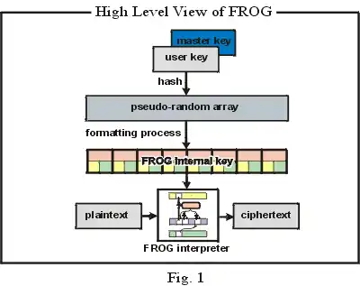 El diseño de FROG era ocultar la secuencia exacta de las secuencias y operaciones, incluso a pesar de que el algoritmo es conocido. Donde otros cifradores usan la clave solo como datos para producir el texto cifrado, FROG usa la clave además como instrucciones sobre las cuales se generará el producto cifrado. De hecho, una versión expandida de la clave es usada por FROG como programa. FROG opera él mismo como un intérprete que aplica este programa dependiente de la clave sobre el texto plano para producir el texto cifrado. El descifrado opera usando el mismo programa de manera inversa.
